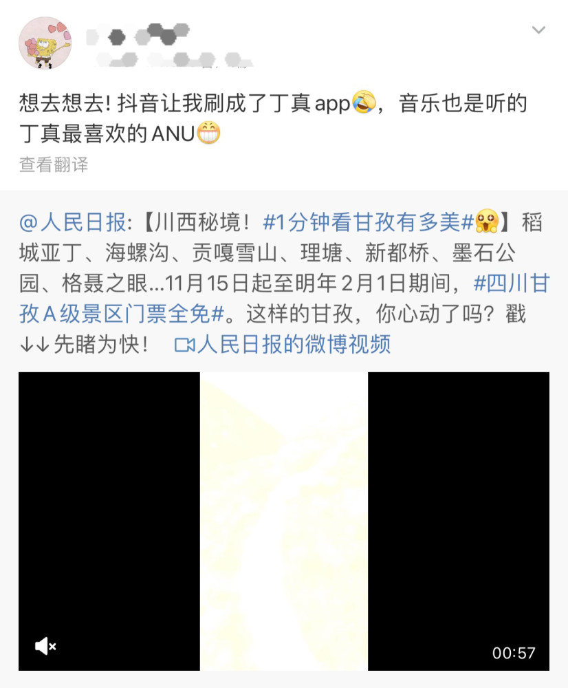 在人民日报一则“川西秘境!#1分钟看甘孜有多美#”的转发微博里,网友“网友粉红小雨伞z”和其他万千“少女粉”一样,因为爱丁真,所以爱上了多元的民族文化。