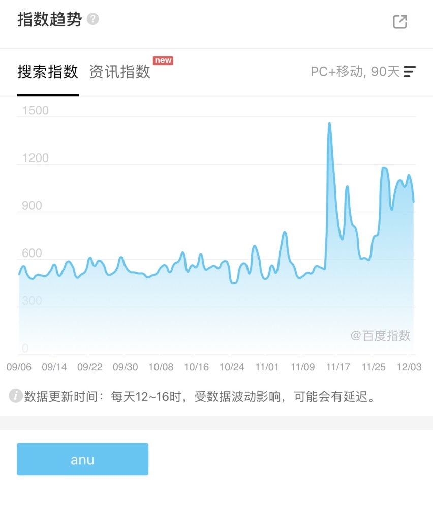 继丁真的小马珍珠、丁真的舅舅一路火上热搜之后,这一次,丁真的偶像终于也被网友爱上了。11月17日开始,ANU的百度指数突然出现了爆发式增长。