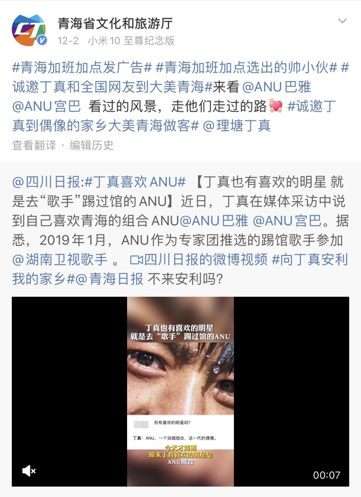 正能量、梦想、向上,是ANU和他们的音乐持续传递的信息。现在的ANU带着新潮藏乐,用全新的演绎方式宣传自己的家乡和藏族文化,成为了青海最新的“野生代言人”。青海省文旅厅甚至在微博带上了“诚邀丁真到偶像的家乡大美青海做客”的标签。