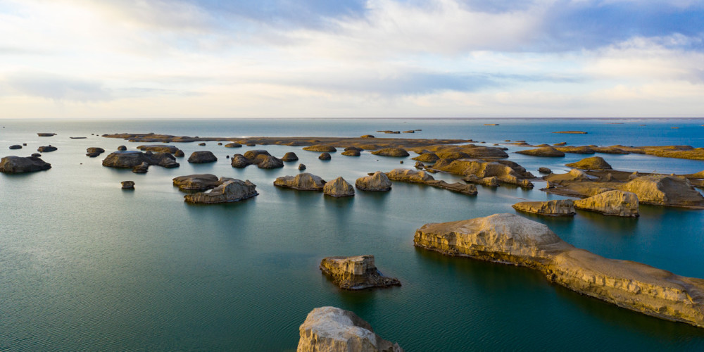 如果你计划走西宁-青海湖-茶卡盐湖-水上雅丹-敦煌-嘉峪关-张掖环线旅游,就能在行程中途与这个“中国西部的千岛湖”来一次亲密接触。在天气晴好的日子,泛着深绿和冰蓝色的湖面清澈见底,湖中形态各异的雅丹石柱随意分布点缀其间,观者移步即异景。日出日落时分,水中雅丹则被日光染上一层暖橙色彩,与静谧幽蓝的湖面形成强烈对比,美得震撼人心。