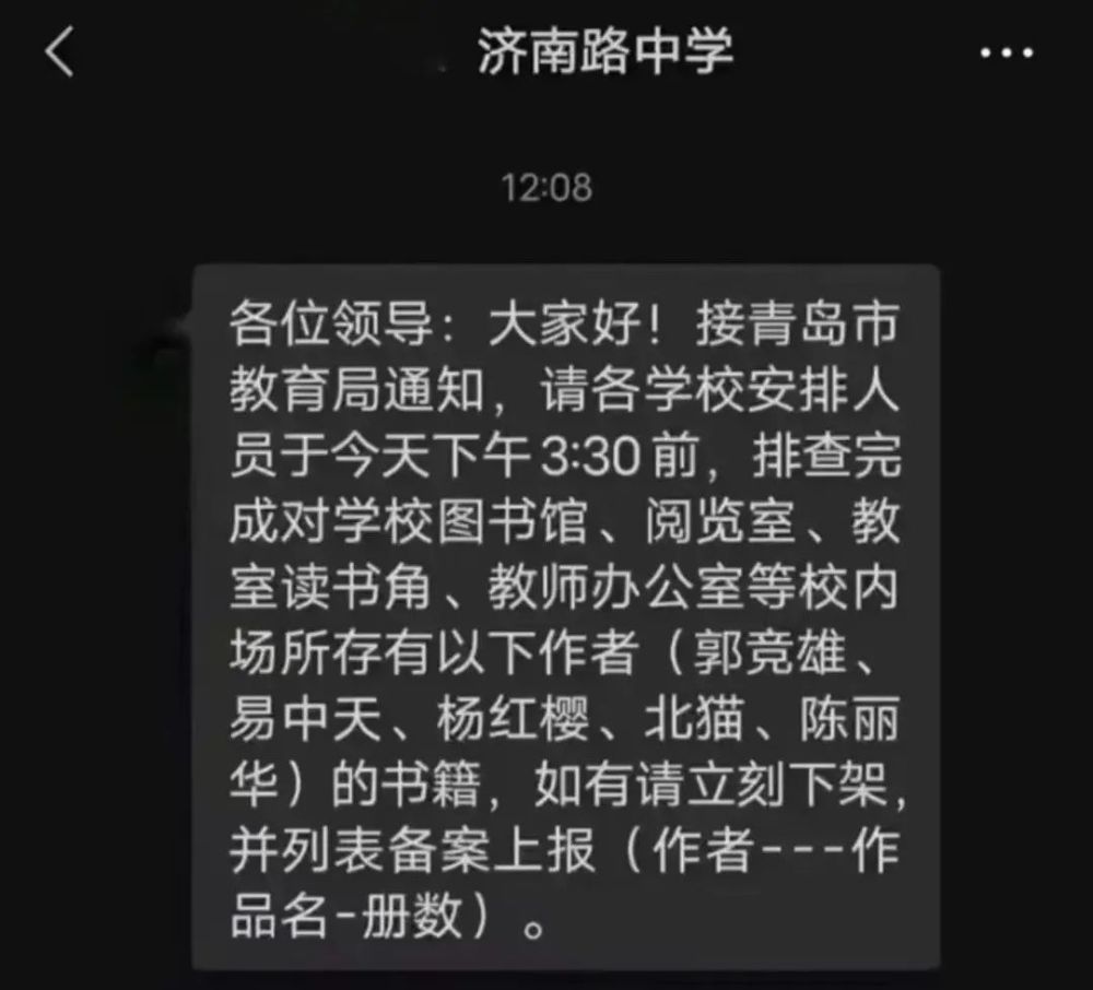 近日,一张网传的微信聊天截图在各个平台被大量转发,内容是山东某些教育当局要求学校下架一些作者的书。这些作者,都比较“大牌”:易中天、杨红樱、北猫、陈丽华、郭竟雄 ...