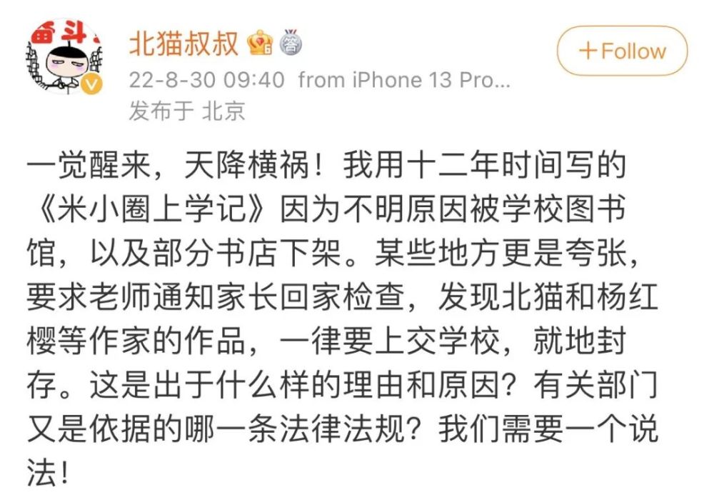 北猫也哭诉:“一觉醒来,天降横祸!我用十二年时间写的《米小圈上学记》因为不明原因被学校图书馆,以及部分书店下架......我们需要一个说法!”