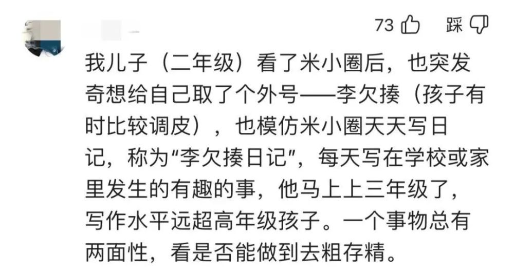 “《米小圈上学记》让我明白我一直害怕的写日记其实不难,可以像米小圈一样把生活中的一些见闻写下来,日记就有内容了。