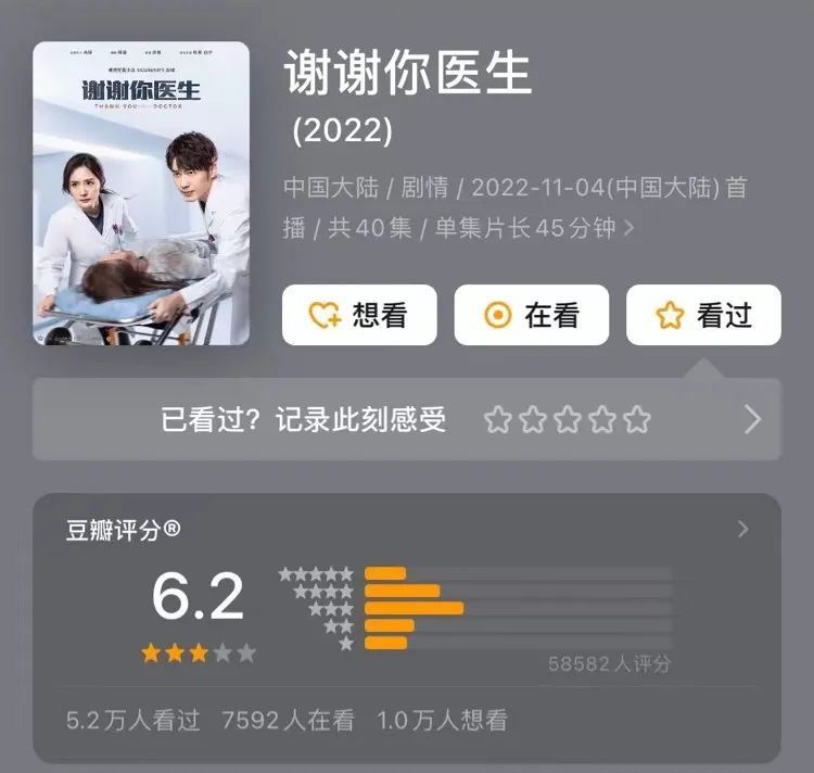 《谢谢你医生》延续了对医疗场景的专业呈现和以医疗案例为模块单元的叙事形式。一方面,偶像元素和爱情戏是本剧的看点之一,是线索和悬念所在,但并未对此大书特书,爱情只是涓涓流淌在剧情的缝隙里;另一方面,本剧关注点放在医院内部的人际关系和职业人格成长上,兼及医学伦理和人文关怀,强化了医疗职业剧的类型特征。这是一种类型元素的取舍,更是一种戏剧节奏的扬弃,体现在本剧前半部分淡化靠爱情戏调控观众情绪的套路,而把浓烈的爱恋放在后半部分——这一安排招致观众的两极化评价,但无疑也为医疗职业剧的情节走向提供了另外一种可能。
