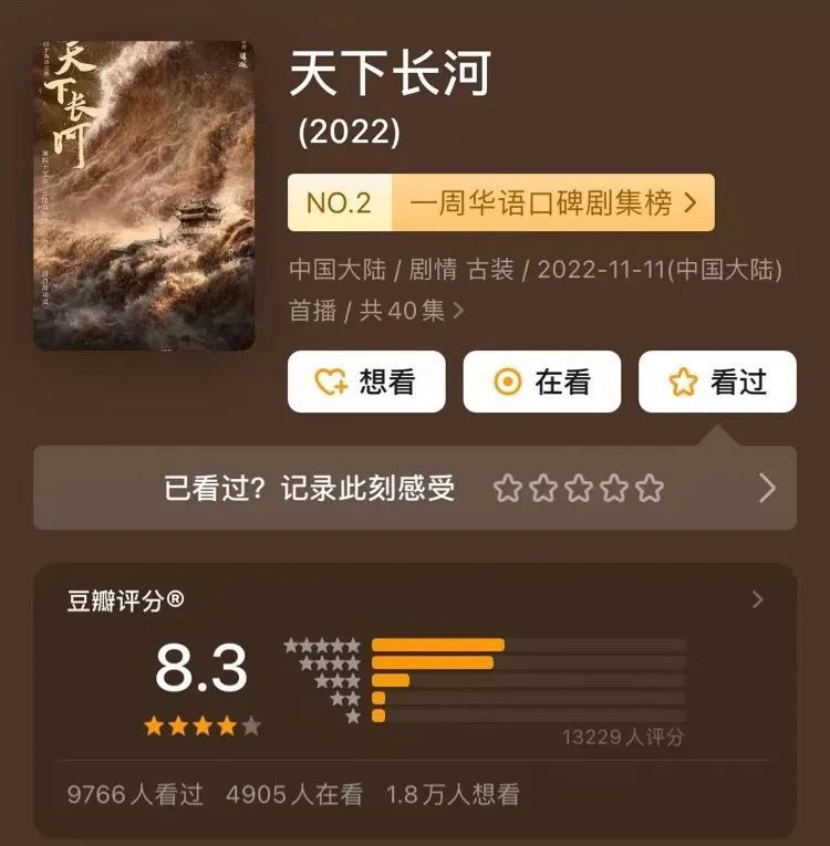 从角色塑造到台词金句,从编剧功底到镜头语言,《天下长河》的历史内涵、题材特点和艺术特色都是同类型作品中的佼佼者,作品中既有气壮山河的治河过程,也有波澜迭起的朝堂论辩,既有舍生忘死的治河先贤,又有坚韧执着的治河精神,拍出了拍出了一部荡气回肠、跌宕起伏的治河史诗,起到了鼓舞当下的现实意。