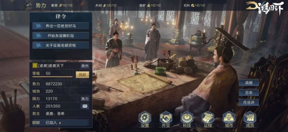 11月3日,【聚英阁】破州城吴,定都于吴,国号为越,改盟名【聚英阁】为【逐鹿天下】。后破城零陵、下邳、襄阳等。自此,南国暂稳,厉兵秣马,北伐将启。