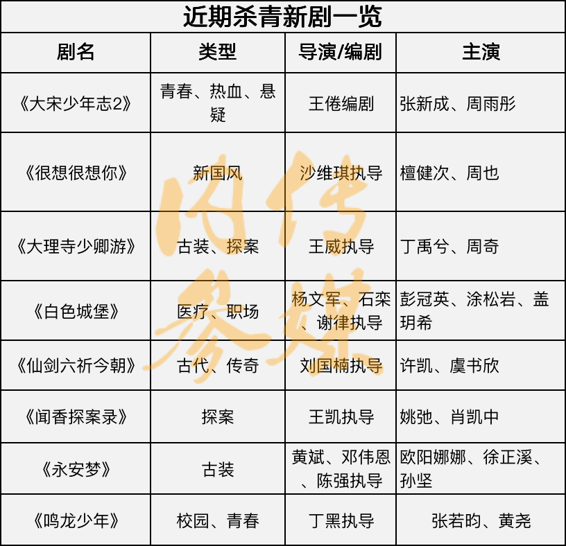 据不完全统计,近期杀青新剧达8部以上,重点剧集包括由张新成、周雨彤主演的《大宋少年志2》,檀健次、周也主演的《很想很想你》,许凯、虞书欣主演的《仙剑六祈今朝》,张若昀、黄尧主演的《鸣龙少年》。
