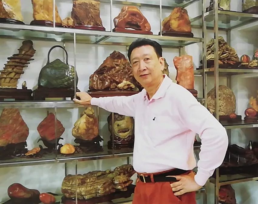陈会长说:“由于腰疾折磨,生活质量受到很大影响,退休两年后仍为腰疾康复多方咨询,四处奔波。2012年4月就在一次腰疾康复咨询途中,挚友陈正定先生尽地主之谊热情接待,送我第一方蜡石,并带我参观一些石馆,与石友谈石论道,我也因缘巧合般地迷上了这些神奇的石头。起初在参与几次石友寻石、购石、赏石的活动中,感觉十分充实开心,回家后一直把玩着入手的几方石头,竟忘记了腰疾的痛楚。奇石对我来说有一种莫名的吸引カ,于是我决定将玩石作为兴趣,丰富自己的退休生活。刚开备受家人和同事们的关注和担忧,担心玩石会对腰疾康复不利,但我还是谨慎地走上了爱石之路。