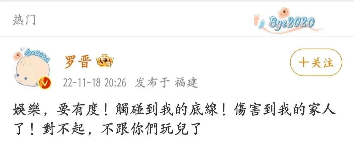 过了没多久后,罗晋直接发文怒怼:“娱乐,要有度!触碰到我的底线!伤害到我的家人!对不起,不跟你们玩了”,疑似是在回应“罗晋新剧老婆被群嘲”的热搜词条,一句短短的话语,罗晋连用3个感叹号,可以看得出来罗晋真的愤怒了。