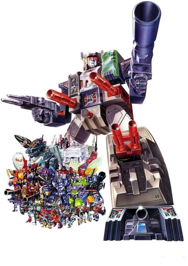 1987年,孩之宝和TAKARA相继推出了头领战士系列玩具,给原本渐趋沉寂的变形金刚市场注入了一针强心剂。而头领战士的领衔人物就是巨无霸福特,号称变形金刚史上最巨大的角色,首先从玩具设定上确实最大(身高53厘米),在动画中也是最巨大的泰坦金刚,猛大帅都只到他的腿部高。如下图