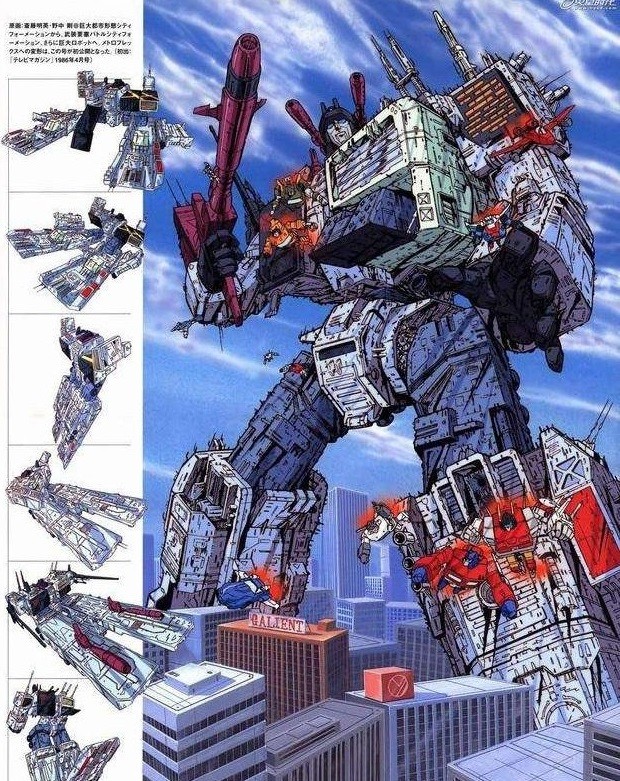 组合金刚所谓摧毁建筑物之类的破坏力,对于他来说不过是小儿科,猛大帅可以轻松移山倒海。其外层防护堪称铜墙铁壁,很少有攻击能让他有所伤损。猛大帅是最大的三变金刚之一,可以在汽车人城市以及移动战斗堡垒形态间自由切换。如下图