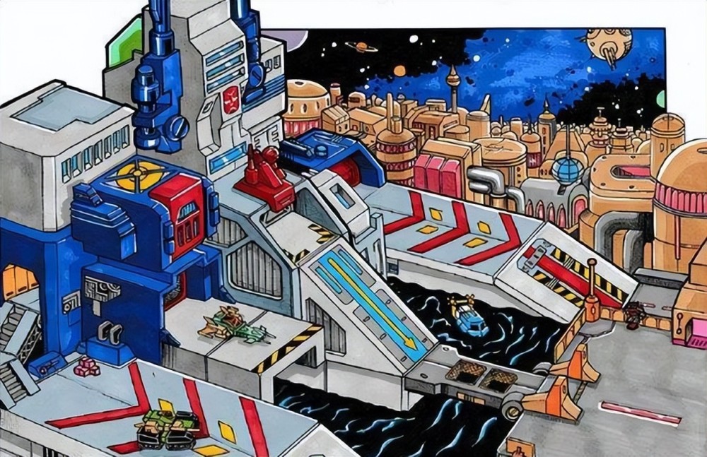 在城市状态下,猛大帅可以为汽车人提供满足各种生活需求的各种设施。配备有维修仓、停机坪、通讯站、生活区甚至娱乐场所。如下图