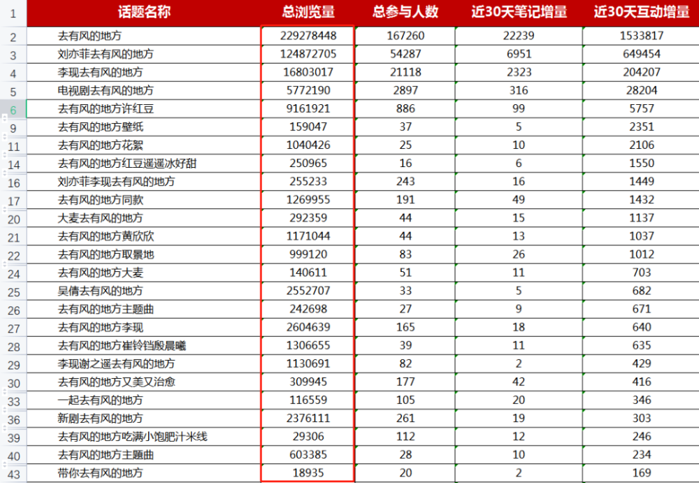 根据新红数据显示,电视剧【去有风的地方】话题在小红书总共被浏览2.5亿。