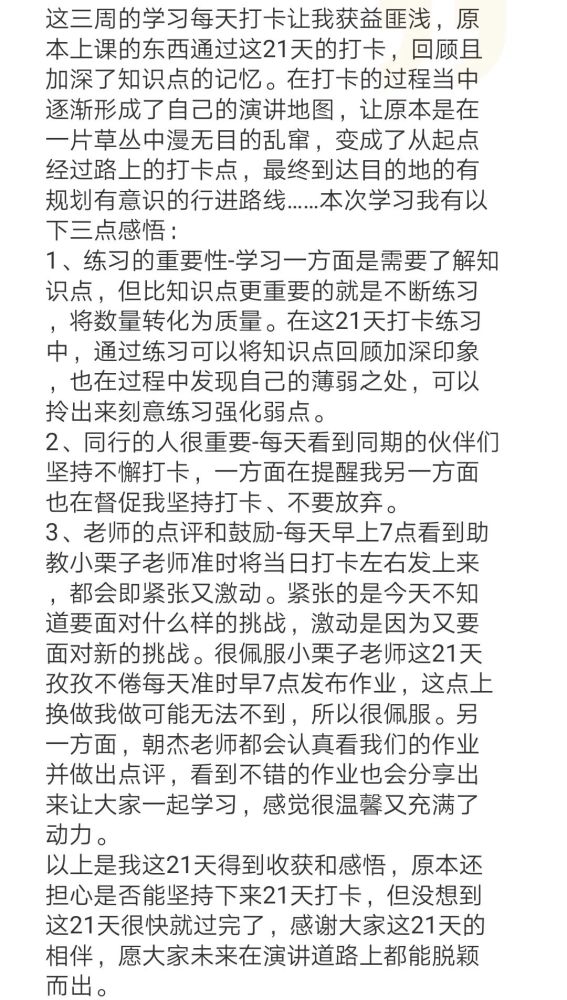 两天演讲集训的道理是类似的,系统学习专业的演讲技巧,以后公开演讲至少有章可循。当然,我们提供了课后持续练习的平台,全程陪伴你成长为演讲老司机。