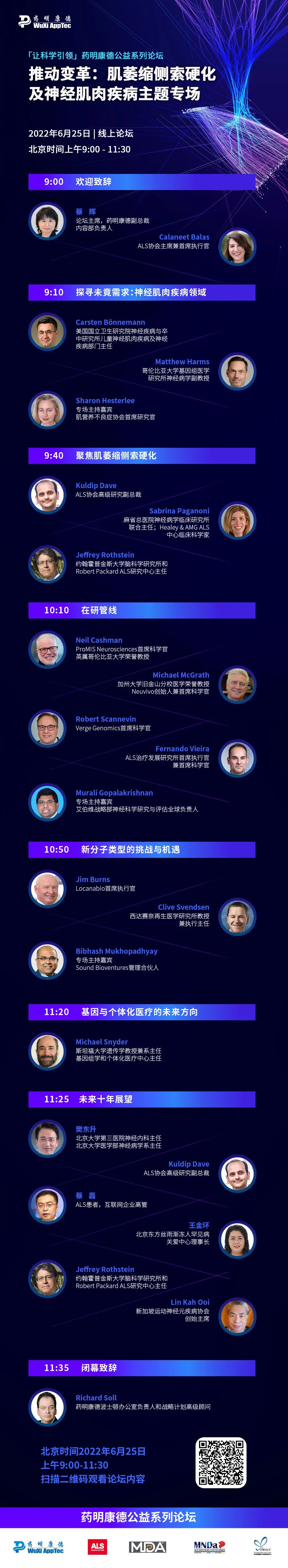 每年6月21日是世界渐冻人日。值此之际,药明康德将举办“让科学引领”公益系列论坛之肌萎缩侧索硬化(ALS)和神经肌肉疾病(NMD)专场。6月25日上午9点,包括蔡磊先生在内,超过20位全球重磅嘉宾将齐聚论坛,从未竟医疗需求、新药研发现状与前沿模式、攻克顽疾的未来蓝图等多个视角共同探寻创新之路,为变革ALS和NMD的疾病管理汇聚合作力量。