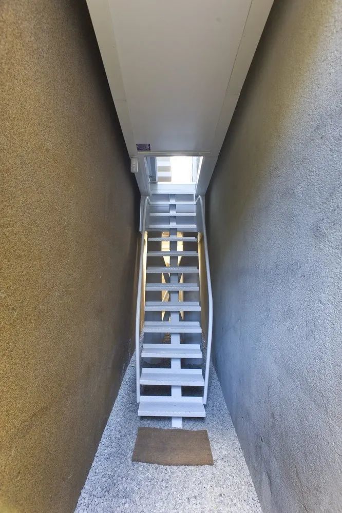 改造后的楼梯采用了轻薄的钢板构架,楼梯下方的空间可以用于储物。为了最大化利用空间,设计师没有选择在右侧加栏杆,而是在楼梯左侧设置了内置扶手。