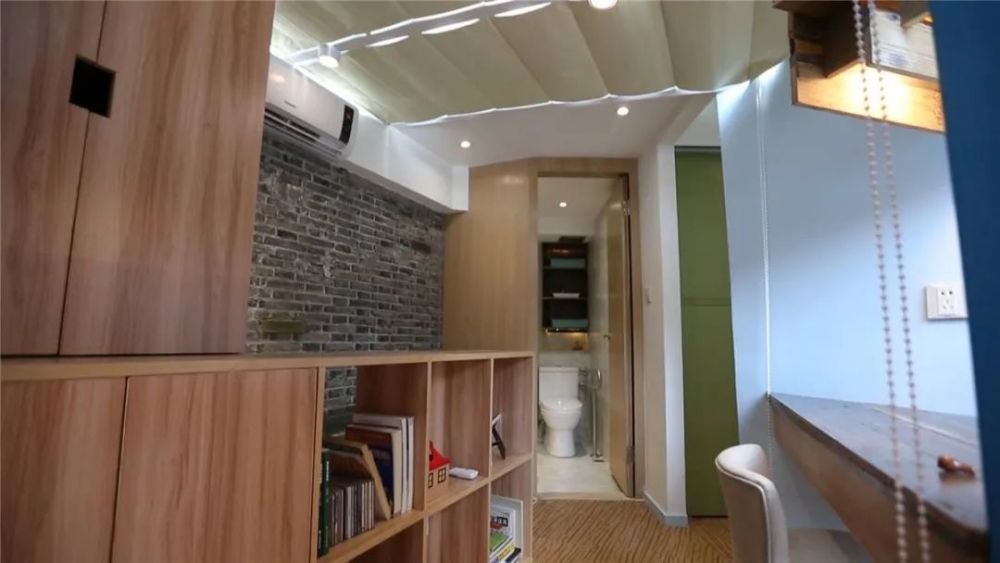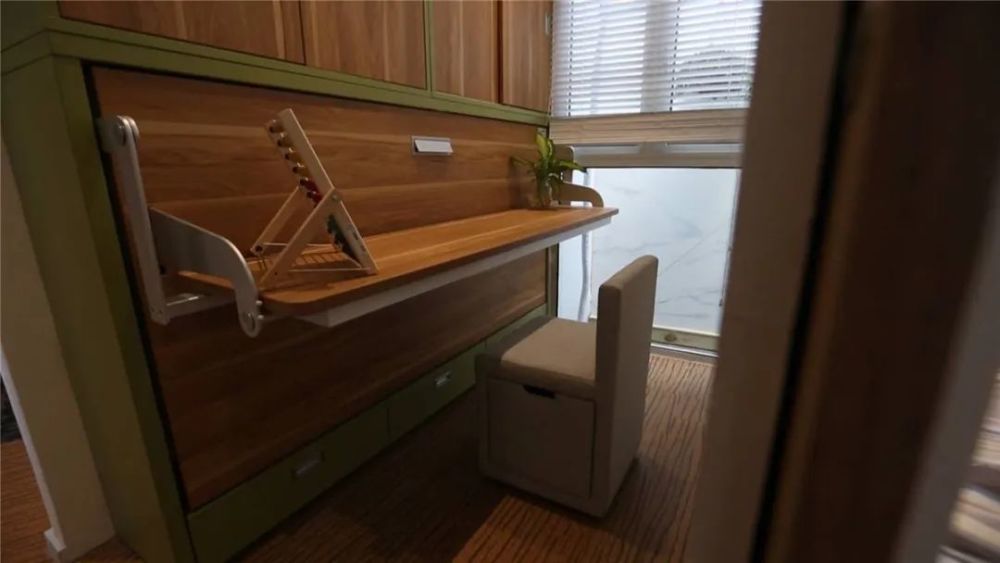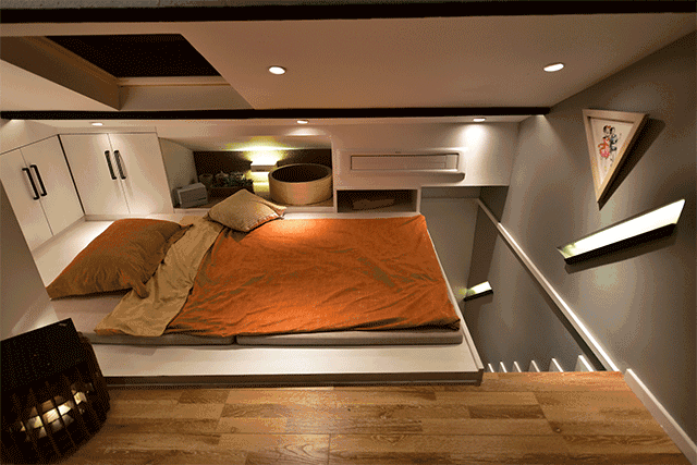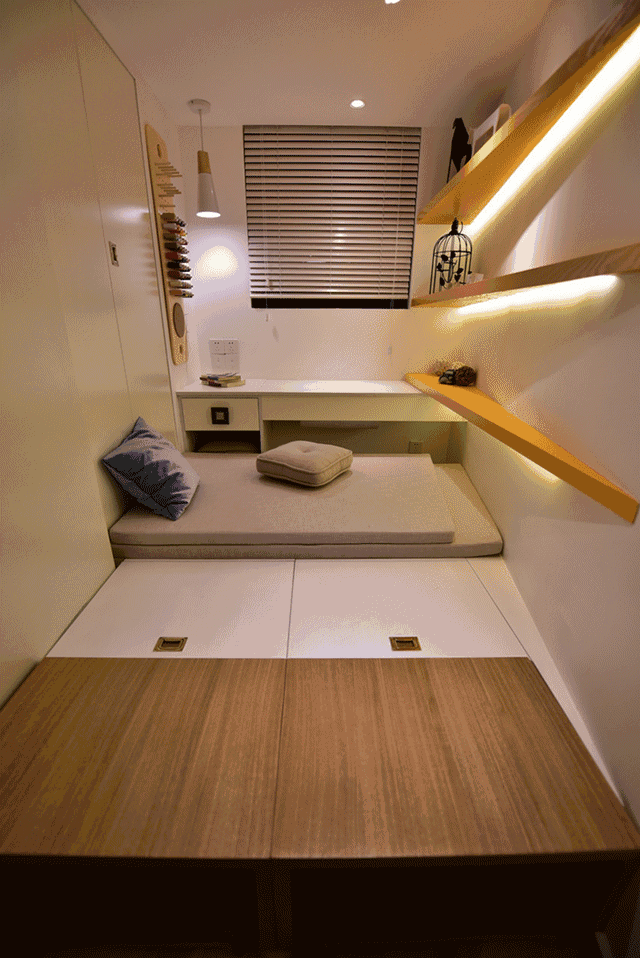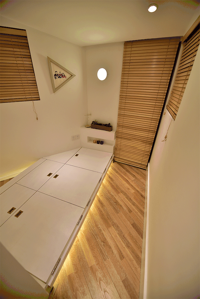 原本是卫生间的区域,被改造成了夫妇的卧室。床下的储存空间,解决了收纳问题。
