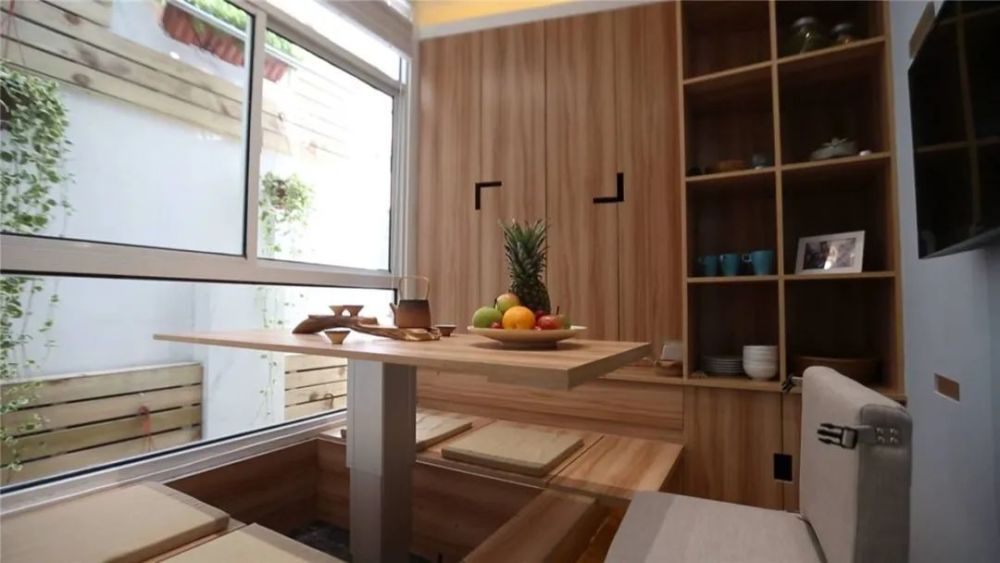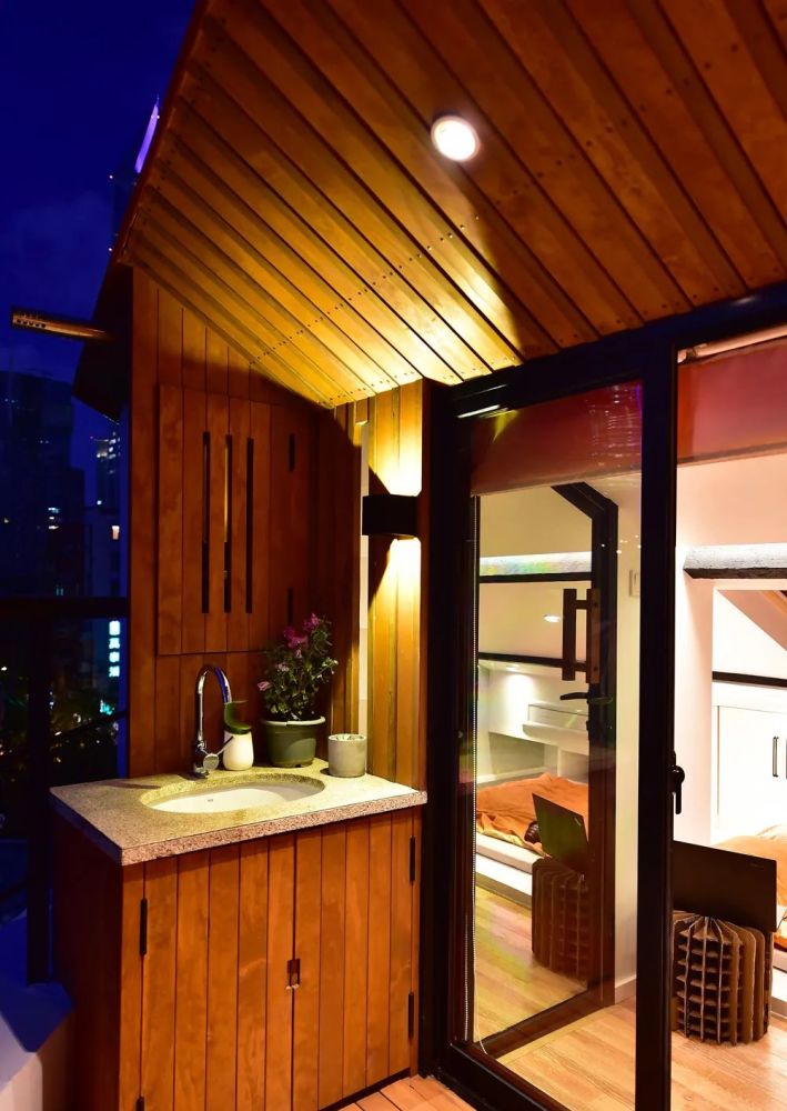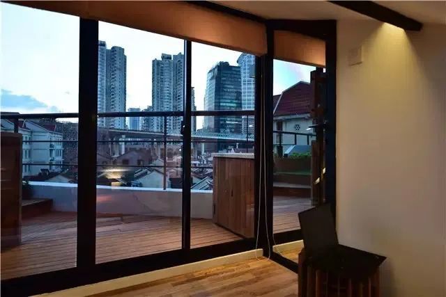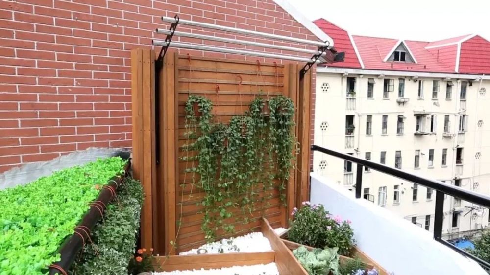 露台被打造成了一个空中花园。衣架被隐藏在用越秀木制作的幕墙中,有了这个安全的露台,再也不用像以前那样,用生命去晾晒衣服了。