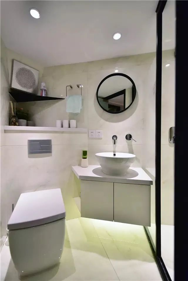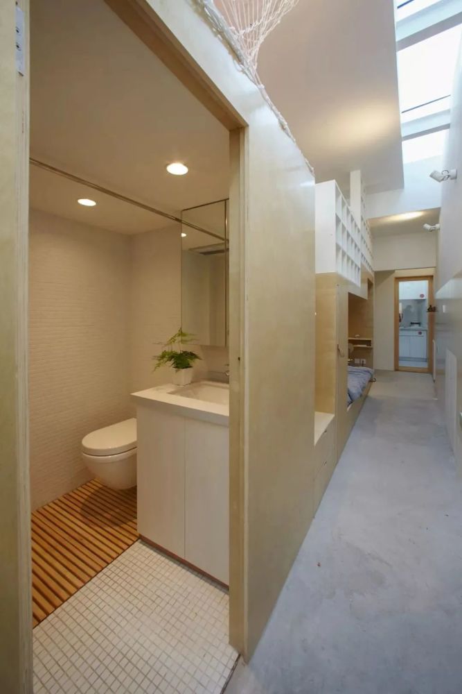 卫生间被清晰地分成了厕所和淋浴的区域,做到了小空间里的干湿分离。三角形区域安放了马桶的水箱和设置成收纳空间。