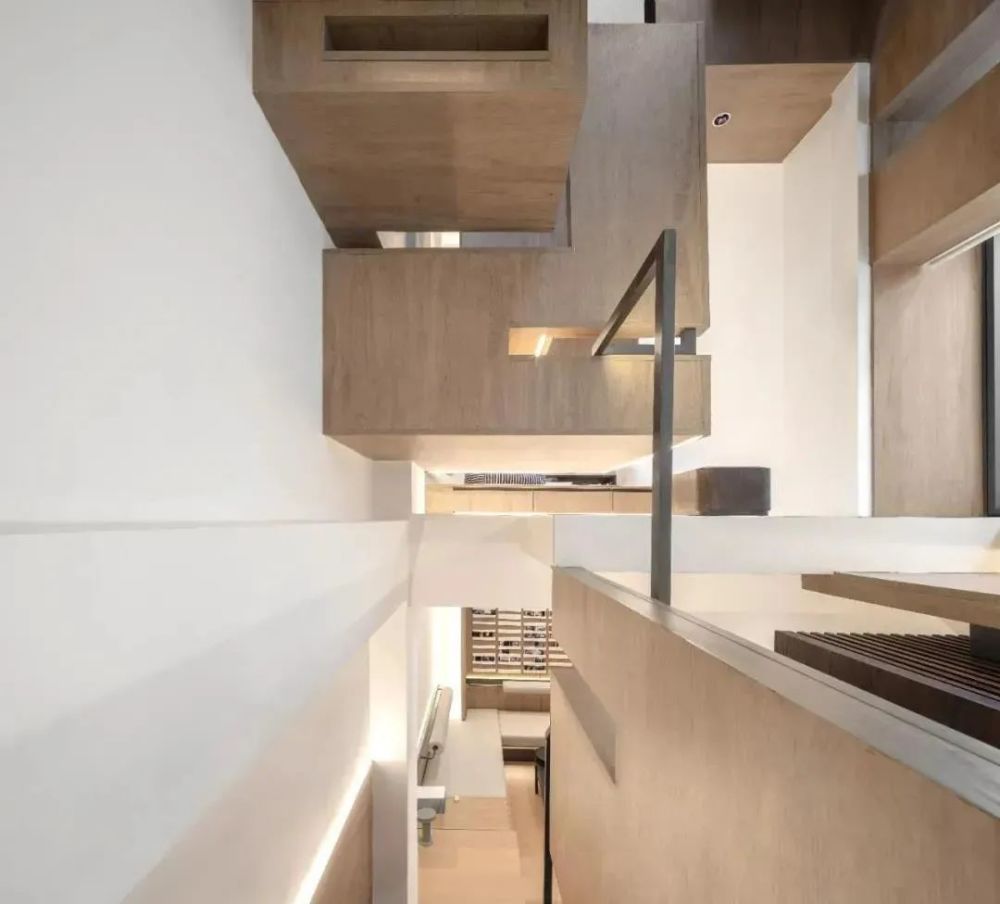 楼梯悬空设计,削弱原本楼梯的笨重感,让整个起居室更加轻盈通透。居住者坐在客厅透过缝隙连通了到厨房的视线,“去走廊化”的处理让空间得到延伸。