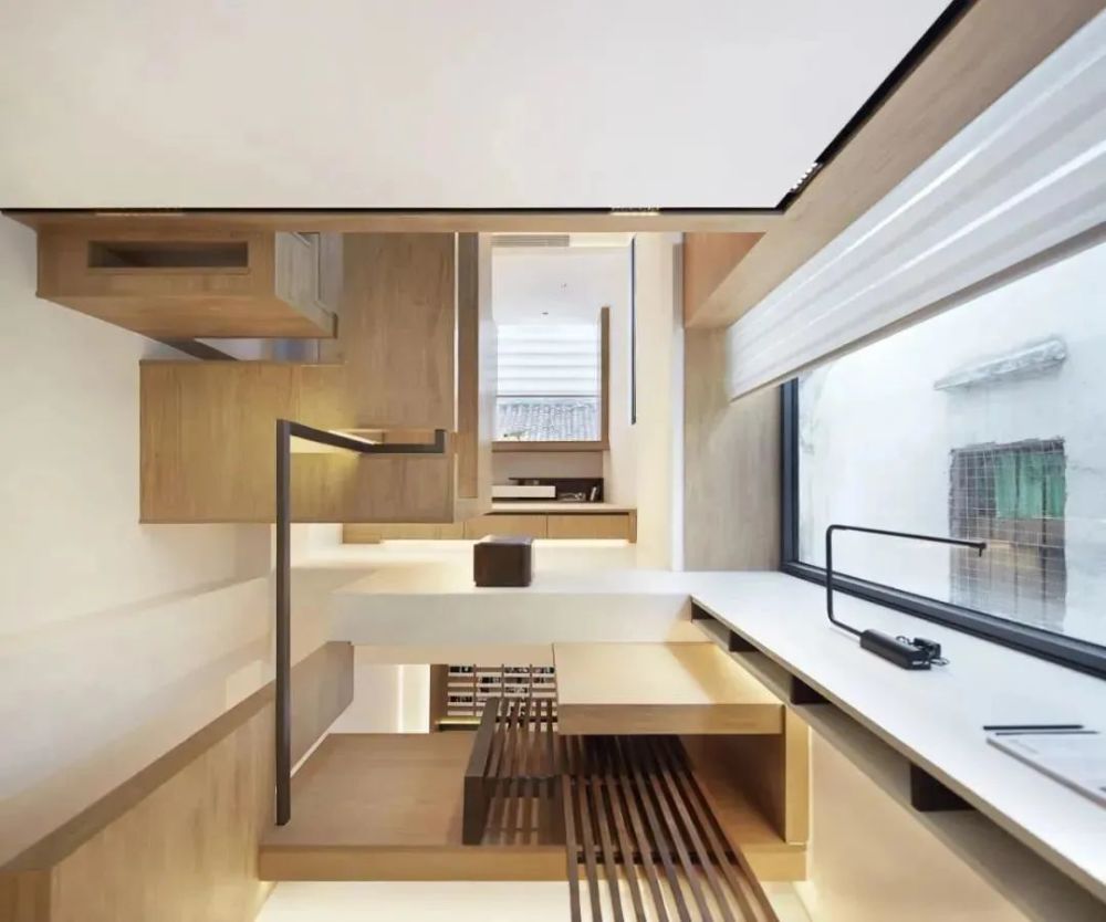 空间中充满组合叠能的设计,一个平台,既是台阶,也可以是工作桌面,书桌,在提高了空间利用率的同时,满足居住者在空间内的多种需求。