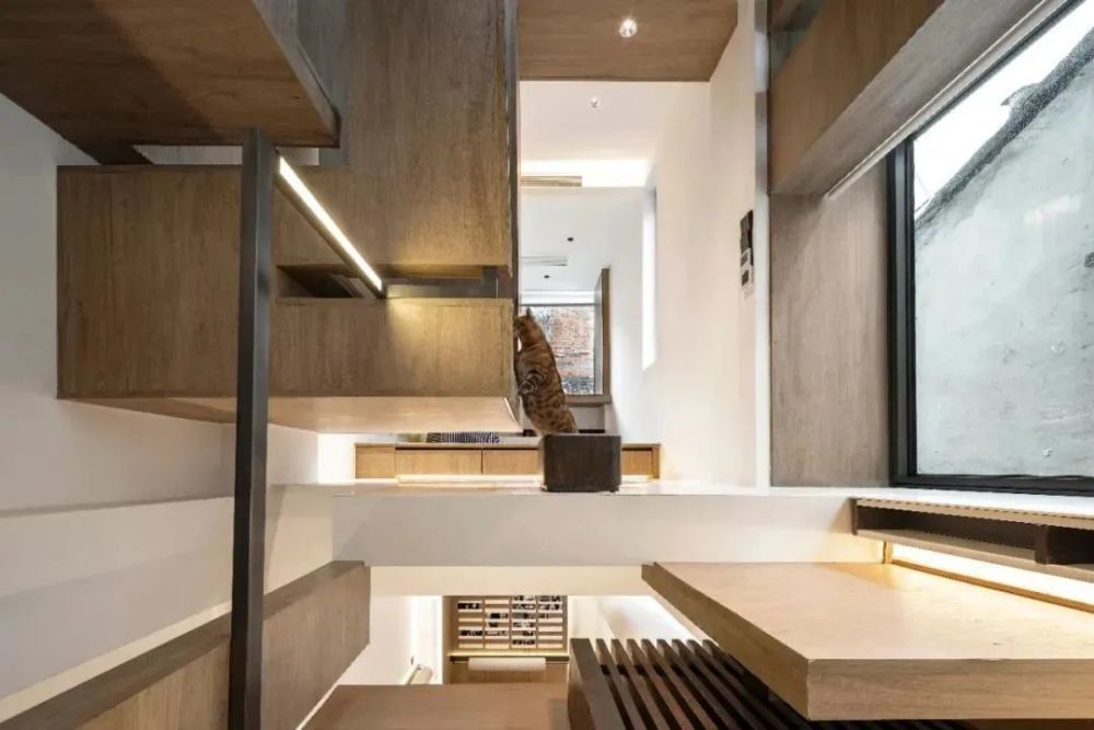 基于猫的习性,设计师在每一层都打造不同的“视野平台”,空间与空间的过渡同时也可以是某个功能模块,独特的结构满足人和猫的行为尺度与视觉感受。