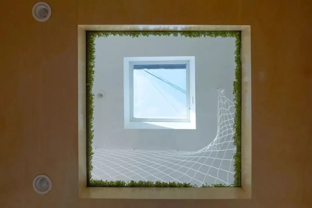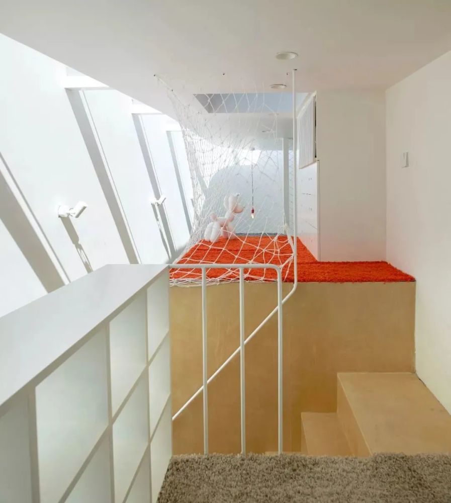 二层的儿童空间是另一个连续层叠的“立体胡同”,为孩子们在室内创造一个可以像户外一样开放自由的游乐场。材料上使用了柔软的白色编织网作为防护,一方面保证孩子玩耍时的安全,另一方面,其通透的特性让孩子可以随时和楼下的大人进行交流和联系。