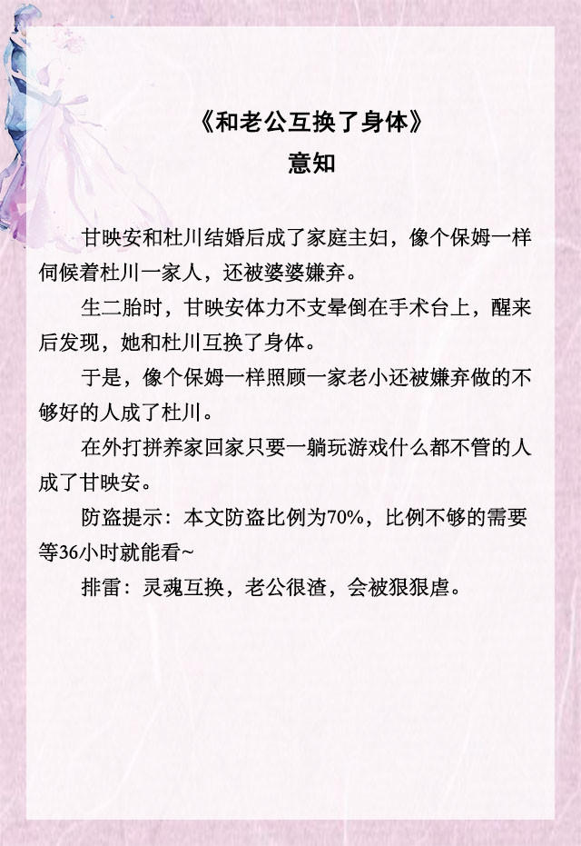 幸好在关键时刻女主和丈夫互换了身体,果断签字保命,从此男主变成了被恶婆婆往死里磋磨的儿媳,女主成了和稀泥的丈夫。几乎全文都在疯狂地虐男主,看着很是畅快,甜甜的恋爱在最后几章,女主跟渣男离婚,收获真正属于自己的幸福。笔触细腻,让人感慨颇深,可以阅读。
