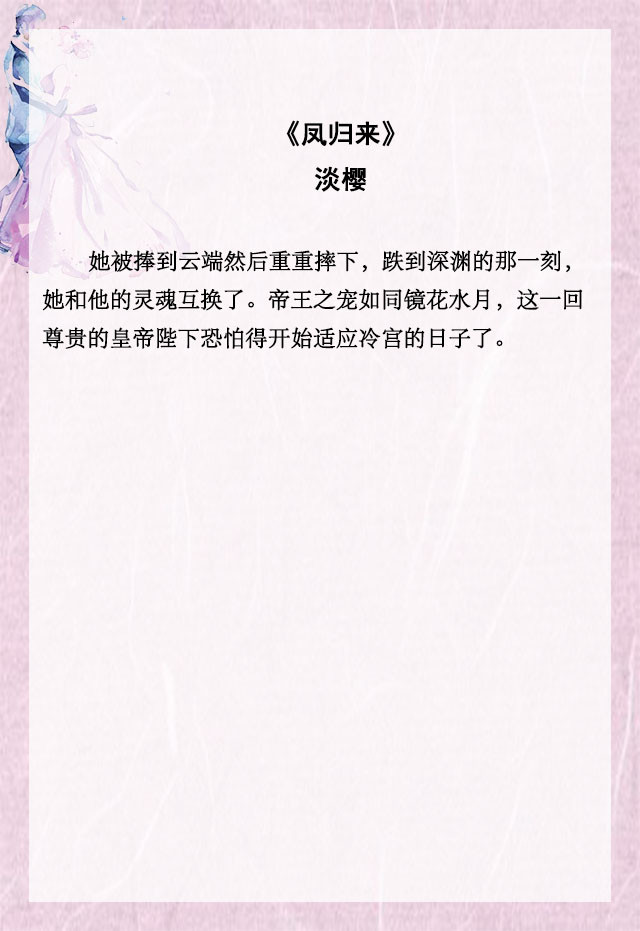 短评:古言宫廷文,灵魂互换,忠犬男主,追妻火葬场。皇帝后宫三千,心有白月光,将女主打入冷宫,硬生生将女主的满腔爱意消磨干净,两人灵魂互换三次,女主放下爱情一心为家族谋划,男主却在这过程中慢慢对女主动心,最后狗皇帝被毒死,女主跟忠犬侍卫男主相守。作者的文笔看起来蛮舒服的,可以阅读。