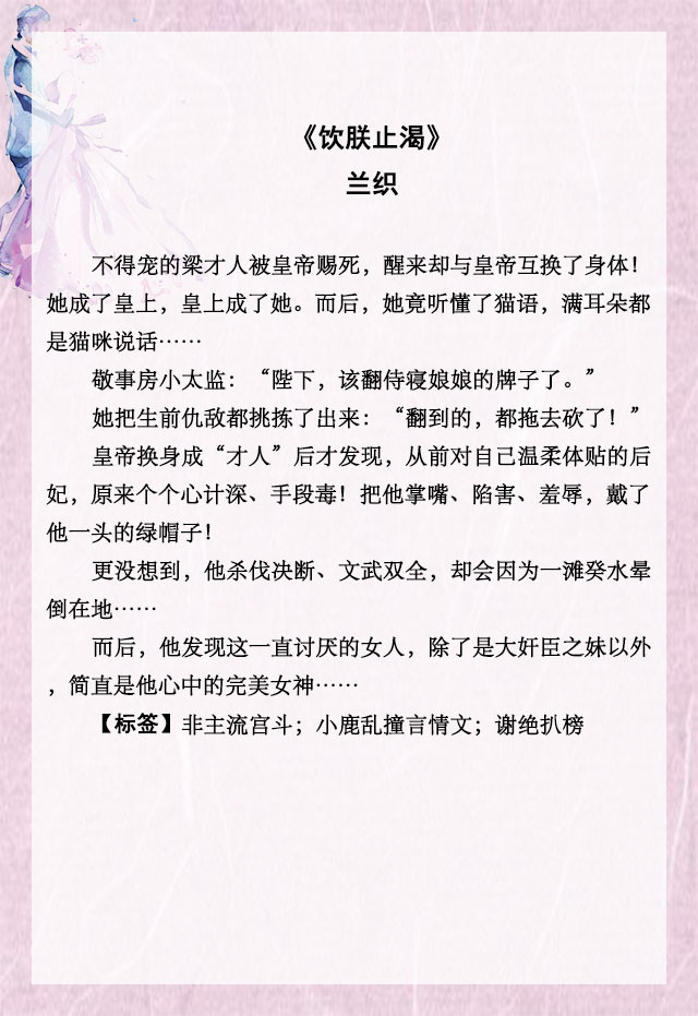 短评:古言宫廷甜宠文,非主流宫斗,灵魂互换。男主刚毅冷静狗皇帝,女主戏精沙雕小才人。女主的父亲当年平江淮之乱,立了大功,却不幸在凯旋途中重病而亡,女主父亲的庶弟替女主父亲领了奖赏,顶了官职,占了府邸,还将女主哥哥赶出家门。女主被庶出叔叔磋磨,禁止读书习字,成了不识字的花瓶,受尽旁人的耻笑。入宫后,女主因为没有文采不被男主召幸,还被两个同在宫中的堂姐针对陷害,过得生不如死。