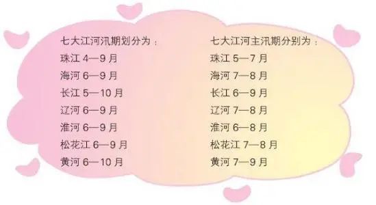 根据降雨、洪水发生规律和气象成因分析,我国七大江河汛期大致划分如下: