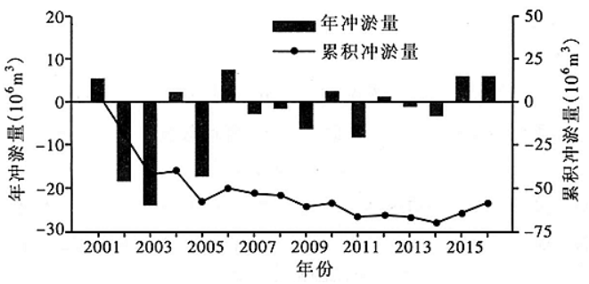 2. 1990年以来,黄河进入枯水少沙期,入海水沙锐减。2002年起,每年的汛期通过三门峡、小浪底等水利枢纽进行调水调沙(通过人工调控洪水,在短时间内将大量水沙集中输送入海),使黄河尾闾河道(位于利津到入水口之间,长约104km)的水沙受人工调控,显著影响了该河段的冲淤变化。冲淤量是河水带走河床所淤积的泥沙数量,是淤积量与冲刷量的差值。下图示意2001-2016年黄河尾闾河道年冲淤量及累计冲淤量变化。据此完成下面小题。