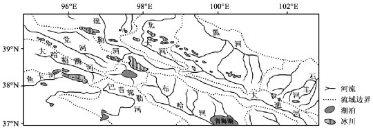 (1)题意表明,疏勒河流域与北大河流域冰川分布区的地形差异应根据冰川面积大小及分布状况进行推测。图中显示,蔬勒河流域冰川面积大,冰川呈片分布,而材料信息表明,祁连山地区的现代冰川一般发育在海拔4000米以上,由此推测蔬勒河流域海拔大于4000米的区域分布广、完整成片;图中显示,北大河流域冰川面积小,冰川呈碎片化分布,由此推测北大河流域海拔大于4000米的区域分布面积小、分散破碎。