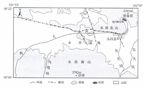 河西走廊西大河流域的永昌盆地介于永昌南山与永昌北山之间(下图),海拔1875~2106m,地势自西南向东北倾斜。盆地内分布有若千块湿地,这些湿地的形成是地形、地质条件及地表水、地下水共同作用的结果。金川峡水库位于盆地最低处,是当地生产和生活的重要水源地。