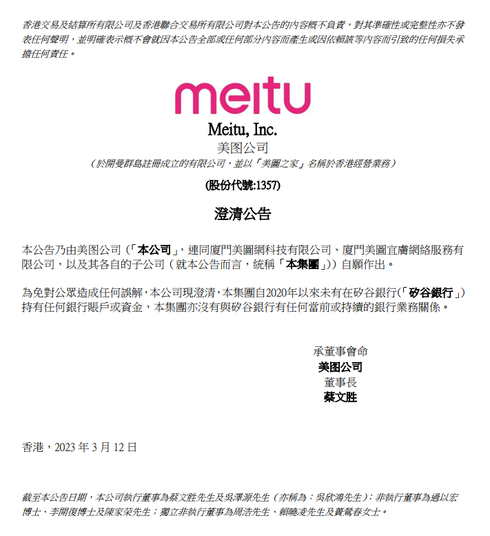 美图公司在港交所公告,集团自2020年以来未有在硅谷银行持有任何银行账户或资金,集团亦没有与硅谷银行有任何当前或持续的银行业务关系。