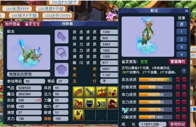 这只蛟龙唯一差的就是成长值了,1.197的初始成长注定它的属性上限无法达到一个极限状态。不过技能很完美,出其不意、力劈华山、风起龙游,小铁还特意去看了下,蛟龙和小龙女确实被划到了龙族召唤兽里面,风起龙游在他们身上是能起效的。玩家接连上了几本红书,3个特殊技能纹丝不动,高偷、高必、夜战都有了,那就直接进阶吧。毕竟这种宝宝继续打书太危险了。