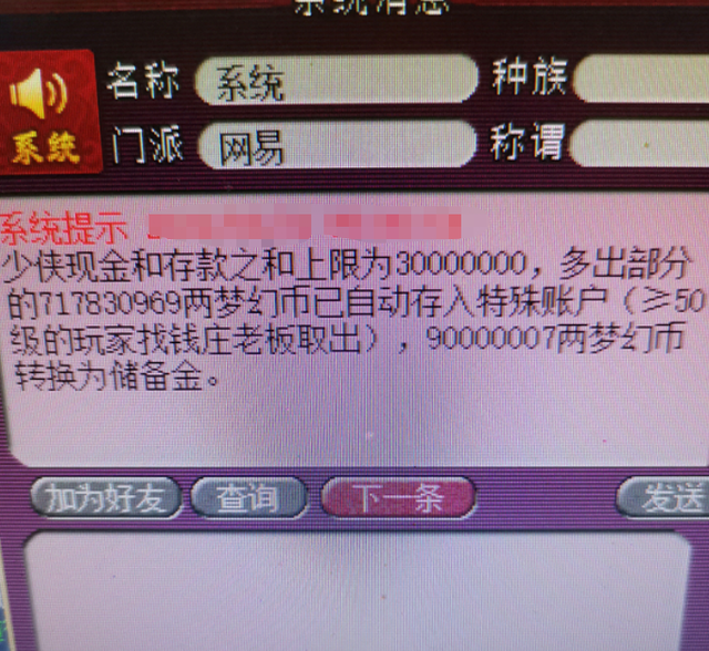 梦幻里最绝望的事情有三个,其一是专用的物理系梦想或者法系梦想的装备低于角色等级,其二是专用无级别的性别或者等级不匹配,其三就是掉线后大量游戏币变成储备金。这位玩家是体验到了第三个,早些年里还能通过申诉找回,每个角色有一次机会,自从修改成自动存储到特殊银行,超出上限的变成储备金后就再也没有申诉找回的机会了。玩家身上带了7亿多的游戏币,最后还是有9000万变成储备金。想想真的痛苦,这些钱都是在垃圾商人号上面,看着就揪心啊。