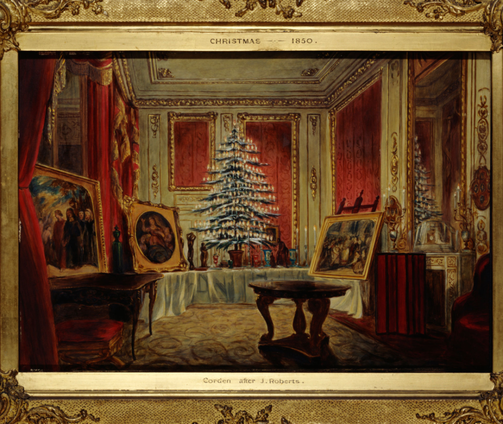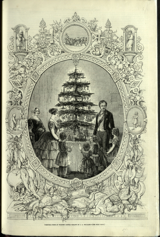 1848年出版的伦敦新闻画报(Illustrated London News)刊登过这样一幅画,在温莎城堡的皇室住所内,维多利亚女王一家人仿照阿尔伯特王子在德国的童年经历,围坐在挂有饰物的冬青树下过圣诞的温馨场景。