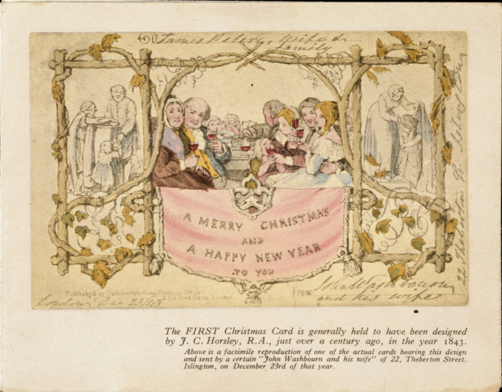 史上第一张寄出的圣诞贺卡复制品,1843年由约翰·考尔科特·霍斯利(John Callcott Horsley)为亨利·科尔(Henry Cole)设计。