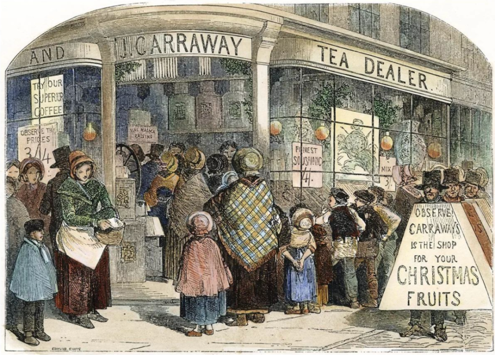 每个阶层的人,都能庆祝圣诞节的到来。在这张 Edmund Evans 的画中,人们排队期望能购买到圣诞享用的水果。
