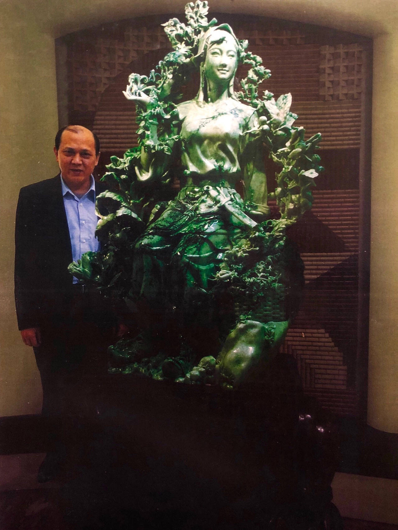 2009年12月5日,北京人民大会堂澳门厅,一场捐赠仪式在这里举行。为庆祝新中国成立60周年和澳门回归祖国10周年,由梁晚年创作的大型翡翠玉雕《滴翠盈银》,捐赠给人民大会堂珍藏。这座大型翡翠玉雕以妈祖造像为题材,雕像高1.8米,青铜底座高0.8米,整个高度为2.6米,总重量达3.8吨,是妈祖题材翡翠玉雕的世界之最。