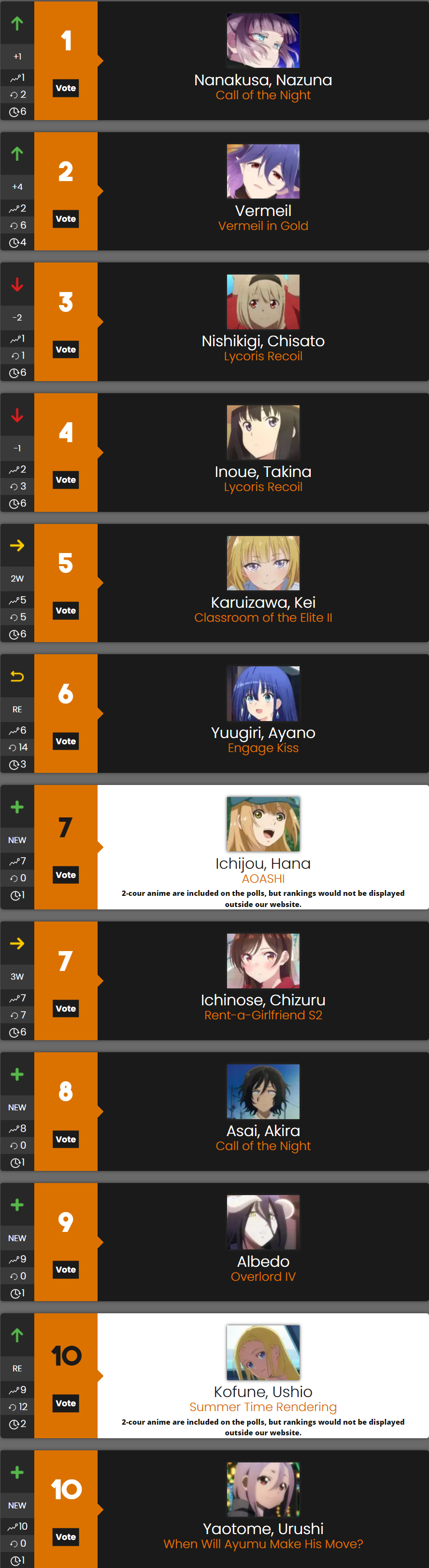 同样也出自《彻夜之歌》,本作的女主角七草荠排在了第7周人气榜的首位。