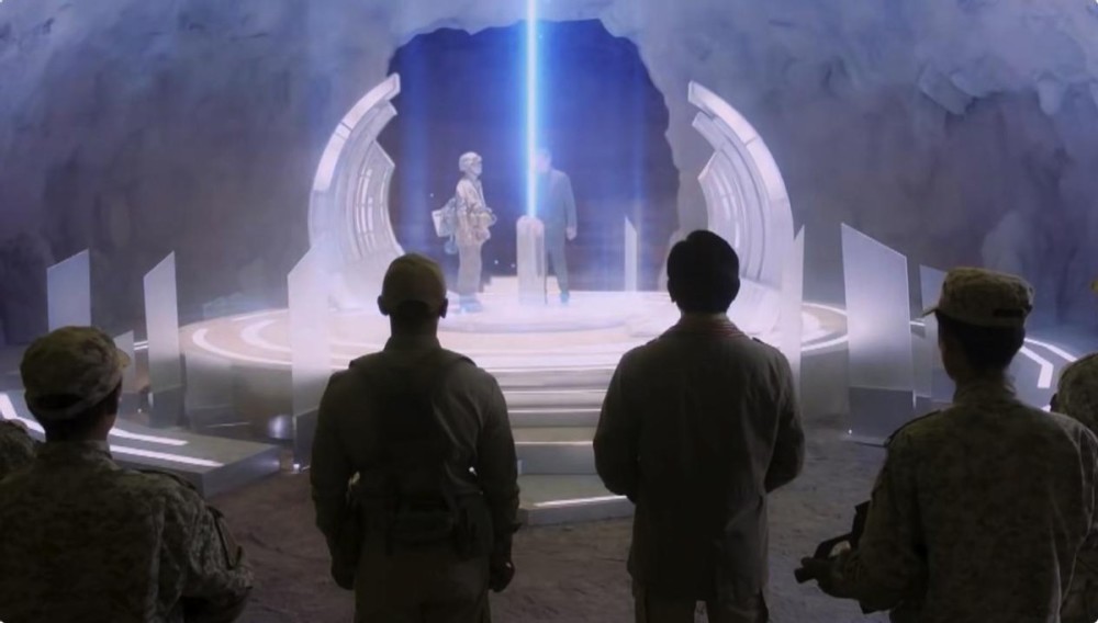 不等观众搞清编剧、导演在玩什么花样。B世界的人就来了,在设定里,百慕泊是一片望不到底的沙漠,而这里也是A、B世界相连的通道。B世界的大佬穿着一身西装登场,然后一套塑料感极强的置景就占满了屏幕。