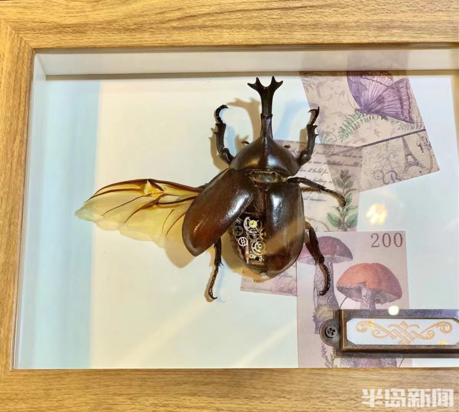 “做这款带齿轮的独角仙标本不仅要耗费大量的时间,也需要我静下心来慢慢做。看似简单的工序,每一道工序都要耗费几个小时。首先要清洗独角仙,再进行解刨,把内脏、肢体处理干净,其次要再进行清洗,把残余物清洗干净以便保存,然后将齿轮放入独角仙的壳内,这一步需要不停地调整位置,再加胶水固定,最后将做好的独角仙用胶水固定在相框内定型。”徐新伟仔细地和记者介绍着做标本的工序。