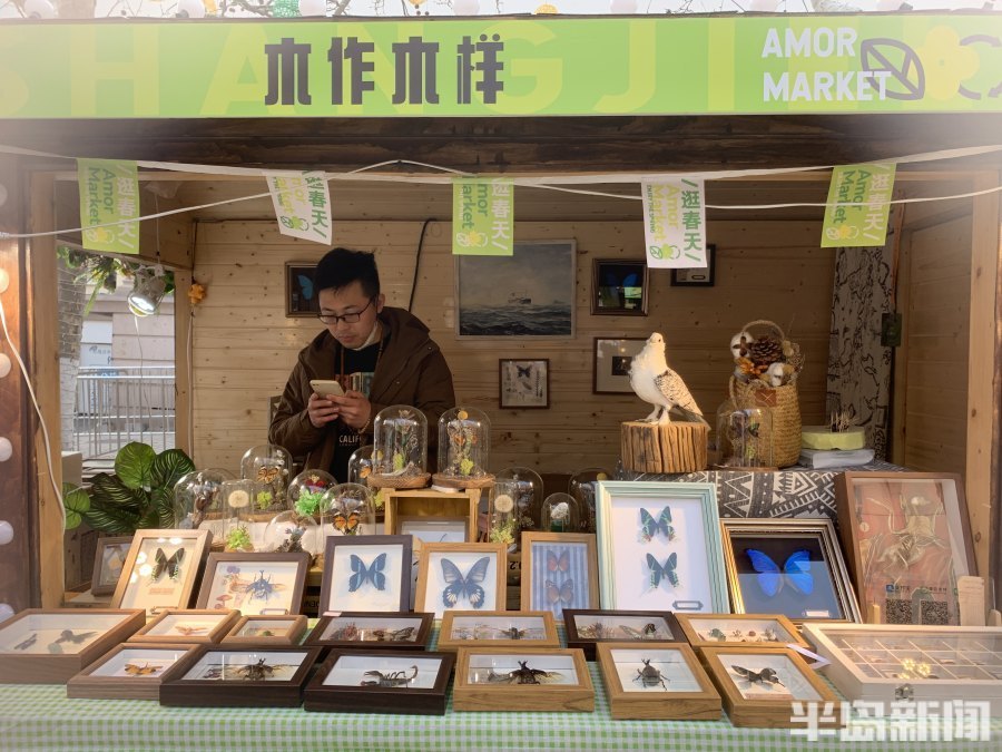 3月27日,记者来到爱尔市集,只见这个名为“木作木样”的标本摊位前围了好几个顾客。摊主徐新伟戴着一副眼镜,长相清秀,穿着一件黄色的外套,正一边招呼着顾客,一边忙着手中的作品。