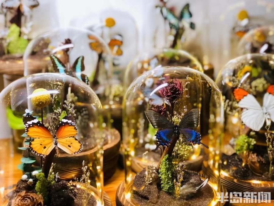 一群小学生正叽叽喳喳地围在摊位前欣赏着标本,其中一个问道:“老板,这个是真的蝴蝶吗?太漂亮了。”徐新伟抬起头回答道:“这是真的蝴蝶。”说罢,又低头忙活手中的作品。