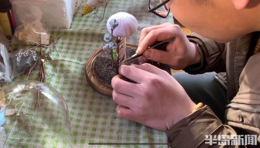 徐新伟边接受记者的采访,边不停地忙活手中的活,他正在制作海胆氛围灯。只见他折一段干花,插进已经用木屑做好的“土壤”中,觉得满意后在干花的枝干粘上胶水,再弄些木屑将胶点遮盖起来。他选择不同的干花、修剪成不同长度插在“土壤”中,多次重复之后,一个具有层次和漂亮的景观布景就呈现出来了。徐新伟介绍:“你看到的布景是制作标本中比较简单的工序,难的是用羊腿骨、海胆、灯带,制作主体部分。我曾反复多次试验用什么材质才能呈现出蘑菇茎的感觉,最后通过多次实验发现羊腿骨最适合,羊腿骨有收腰的感觉,和蘑菇茎最像,还需要将羊腿骨去脂,再将灯带穿到羊腿骨中,羊腿骨与海胆粘在一起,组装灯带的时候最费时间,做完整个氛围灯需要半天的时间。”