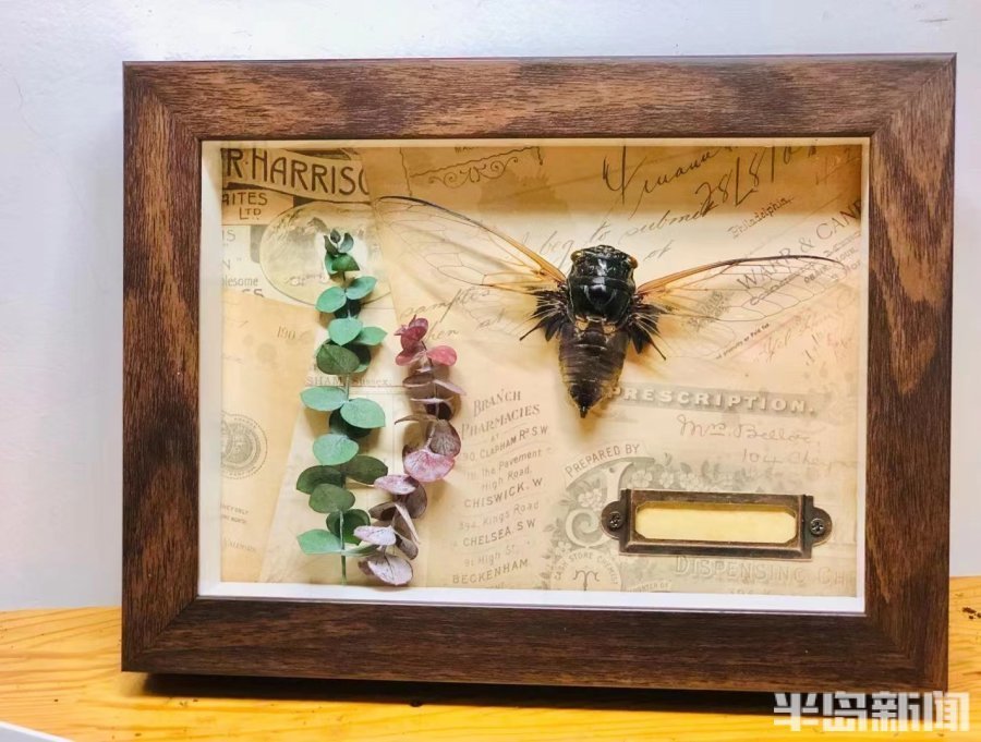 徐新伟介绍道:“我这个摊上标本的取材基本上是我捡的,羽毛、树枝、树杈。在厦门时,我就经常在路上捡各种素材,厦门的蝉在马路上也随处可见,我捡了很多做蝉的标本。有一些北方游客看到我做的蝉标本很惊讶,竟然能把北方吃的蝉做得如此精美,他们会买回去摆放在家中做装饰品。”