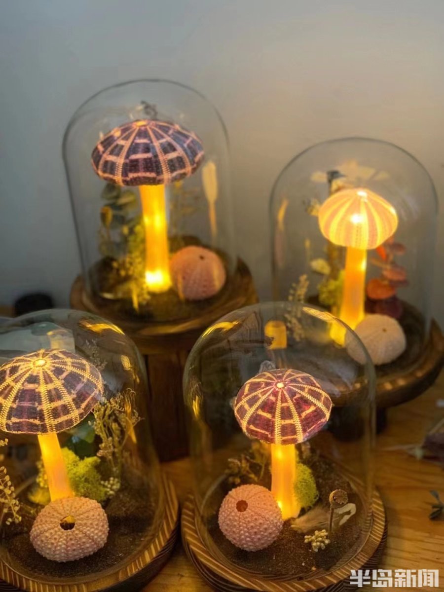 说罢,徐新伟将做完的海胆氛围灯扣上玻璃罩,打开灯带的开关,放在怀里兴奋地向记者展示。羊腿骨透露出不同的亮度,海胆上的小孔往外透露着灯光,画面梦幻得好像童话故事里的场景一样。