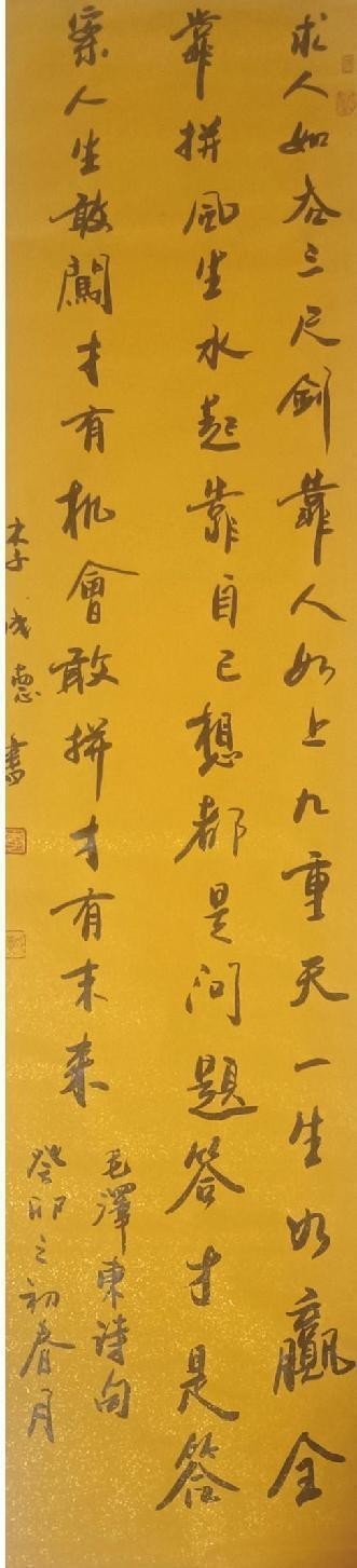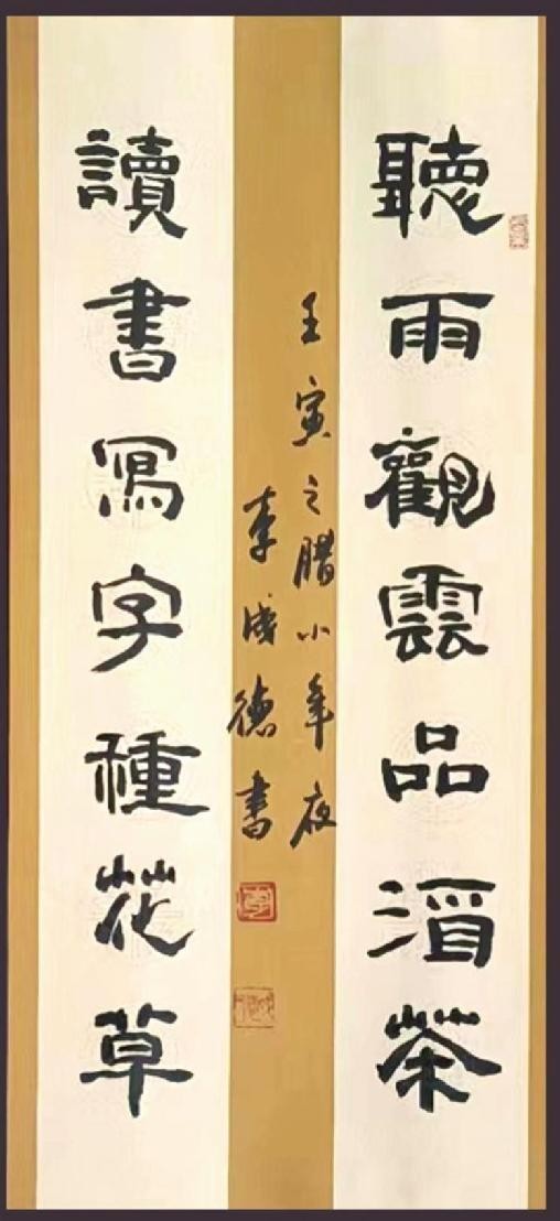 李成德,男,现年57岁,系浙江省湖州市长兴县人,国家高级书法师,中国书画频道会员,退伍军人,80年代在部队服役时有缘结识著名书法家金吕夏,卢乐群两位大家,并得到两位大家的细心指导。楷书以颜柳入门,行书以二王和杨凝式,李邕等,隶书以曹全碑,史晨碑,兼学魏碑泰山石刻等各中碑帖。
